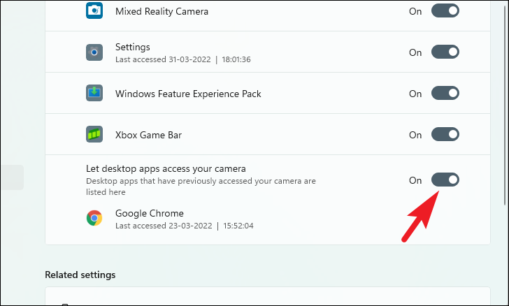 Scroll down and click Camera privacy settings under Related settings.