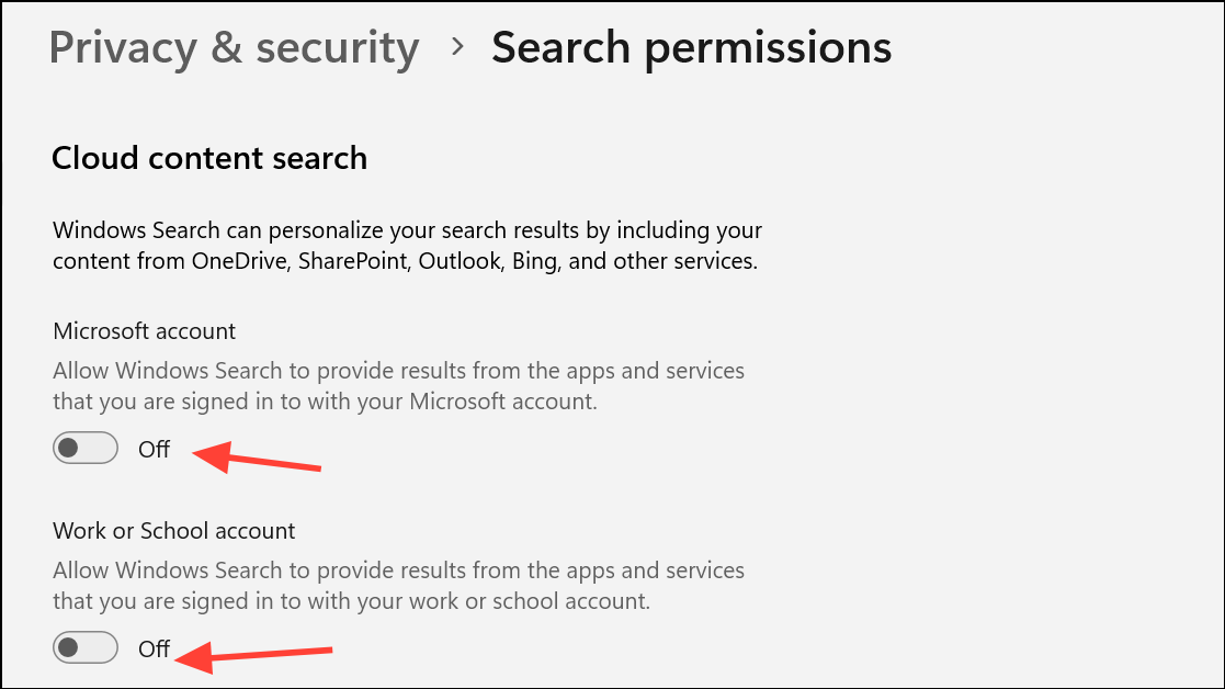 Step 3: Managing Cloud Content: Scroll to the “Cloud content search” section. Here, you’ll find toggles for your Microsoft account and your work or school account.