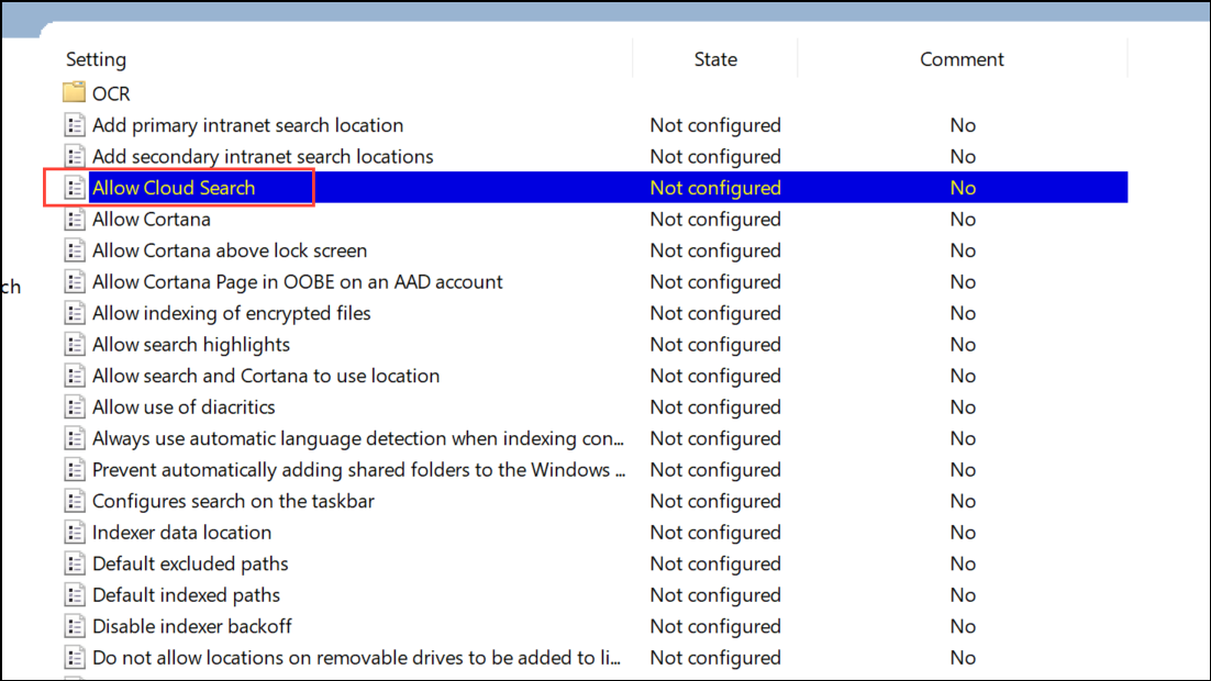 Step 3: Locate the Cloud Search Policy: Double-click on “Allow Cloud Search” in the right-hand pane. This policy governs whether cloud content appears in search results for all users on the device.