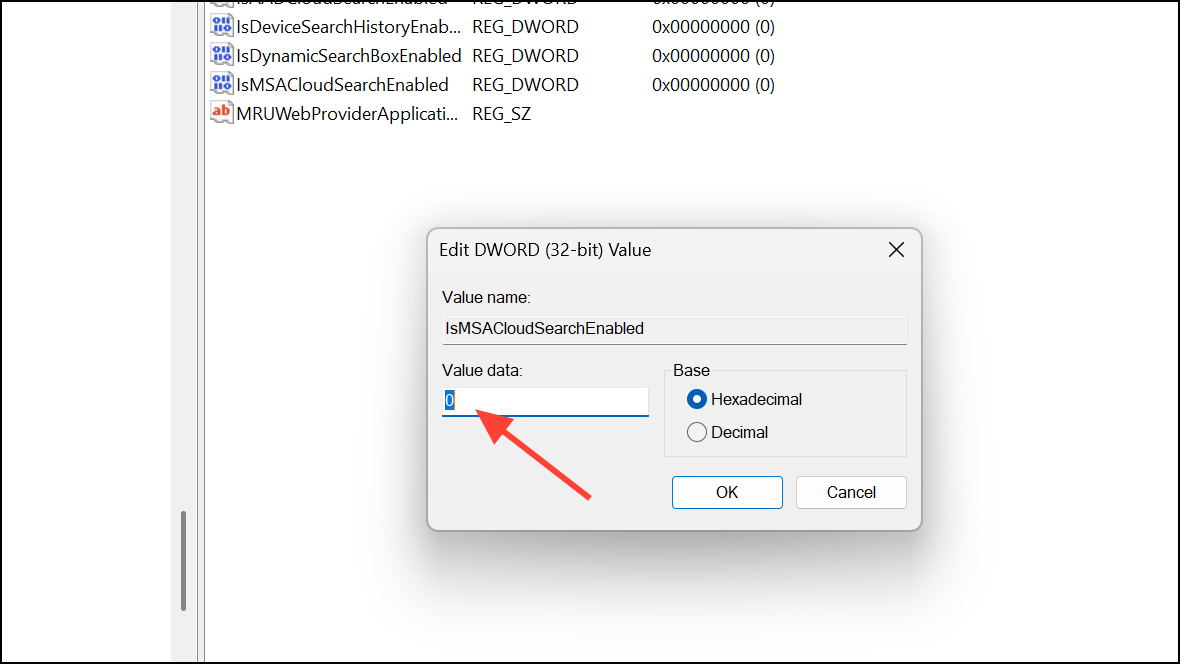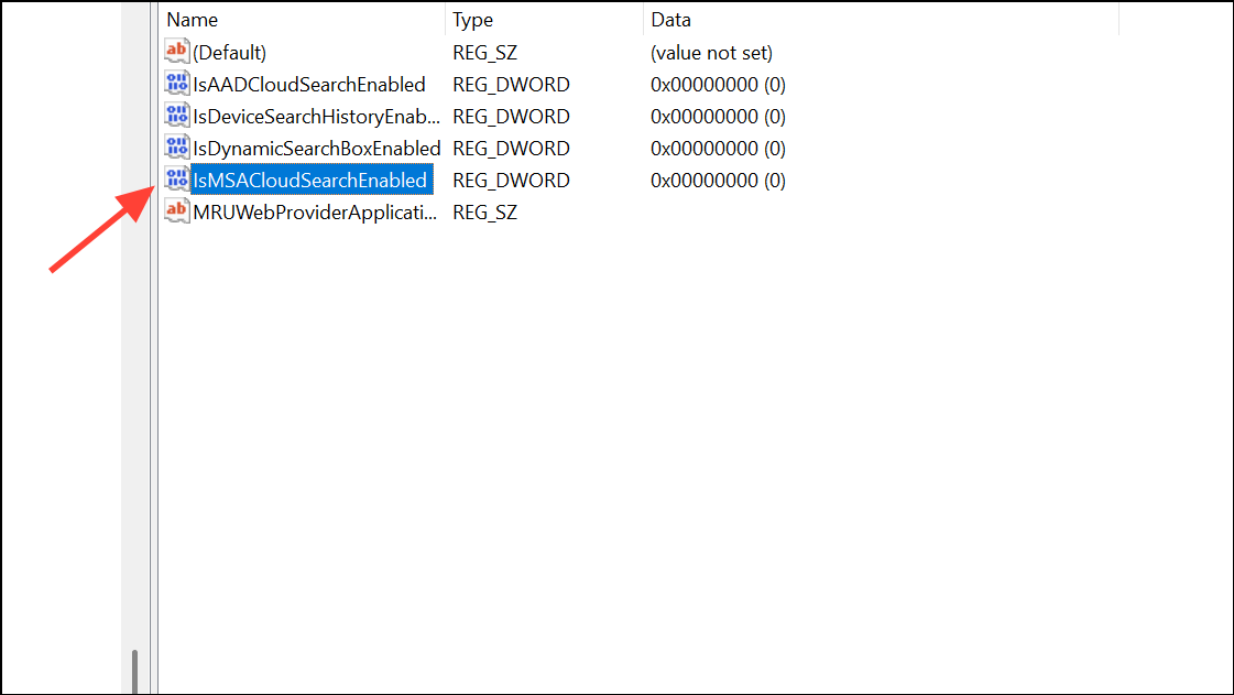 Step 3: Microsoft Account Cloud Search: To control cloud search for your Microsoft account, locate or create a DWORD value named IsMSACloudSearchEnabled. Set its value to: