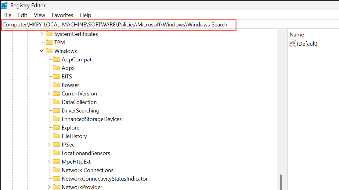 Step 1: Navigate to the Search Policy Key: In the Registry Editor, navigate to: HKEY_LOCAL_MACHINE\SOFTWARE\Policies\Microsoft\Windows\Windows Search.