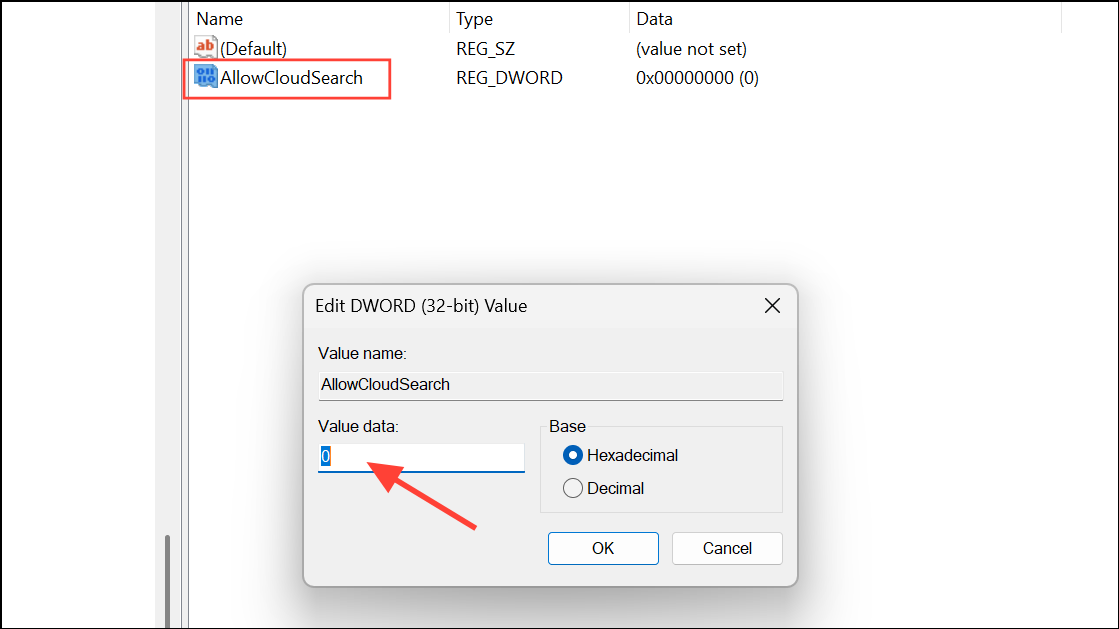 Step 4: Work/School Account Cloud Search: For work or school accounts, use the DWORD value IsAADCloudSearchEnabled within the same key. Set its value to: