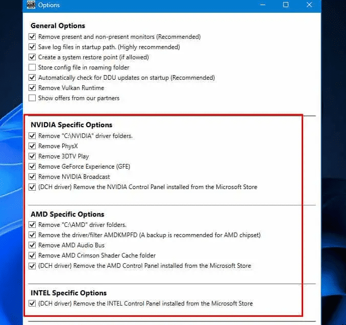 4- Check all the options in NVIDIA, Intel, and AMD Specific Options.
