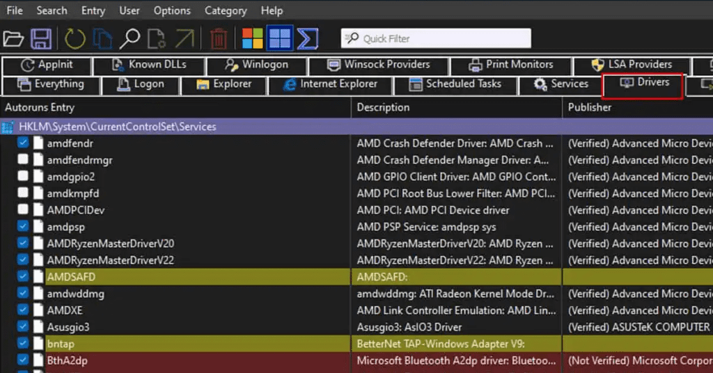 To remove drivers that operate in kernel mode, use a special utility from Microsoft, named Autoruns.