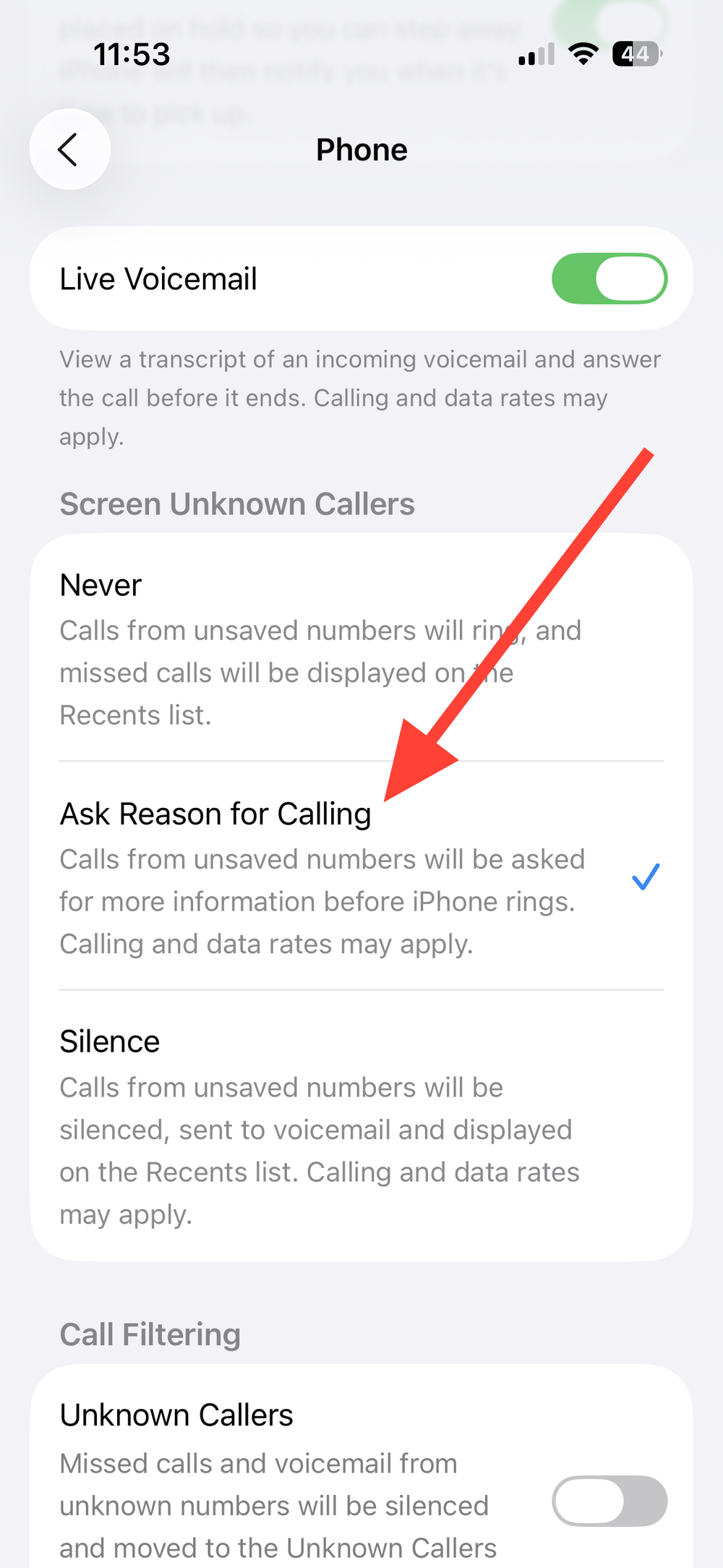 👉 Your iPhone will silently answer unknown numbers, ask for the caller’s name and reason, and transcribe it before ringing.