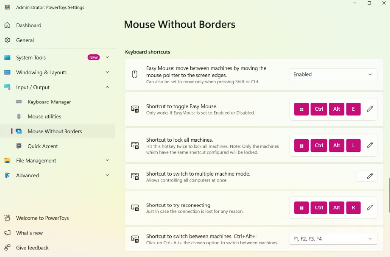 Mouse Without Borders is Microsoft’s free software KVM (Keyboard, Video, Mouse) alternative built into PowerToys. It allows you to: