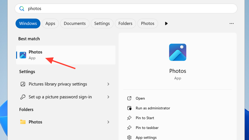 Press Start, search Photos, and open the Windows 11 Photos app.