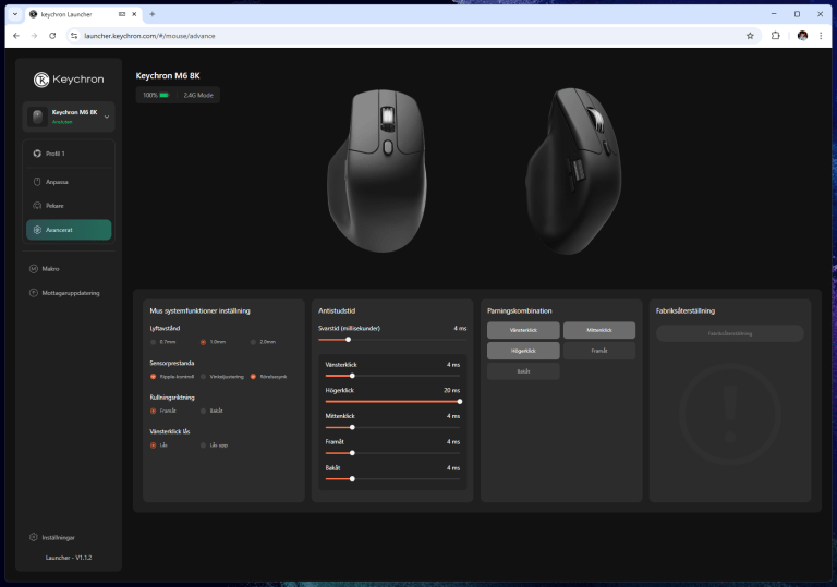 Keychron’s interface runs entirely in the browser—no software install required. Here you can adjust DPI, lift-off distance, response time, and save up to five personal profiles. There are pre-made profiles for several popular games. All settings are stored locally on the mouse, so they follow you between devices. It even automatically displays in your local language.