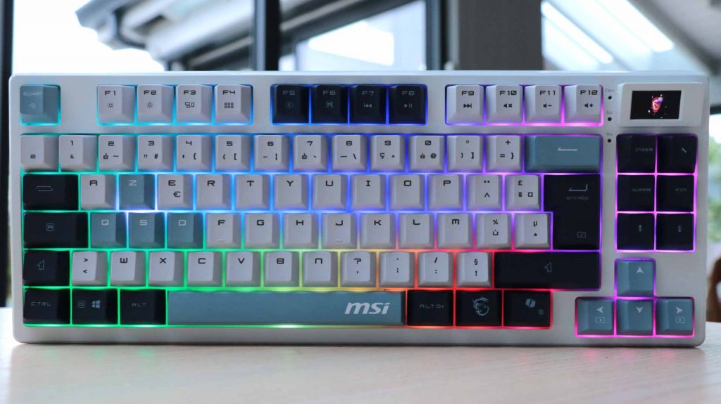 Each key features per-key RGB lighting with 20 adjustable effects. MSI smartly positioned the screen at an upward angle, making it easily visible even when the keyboard lies flat.