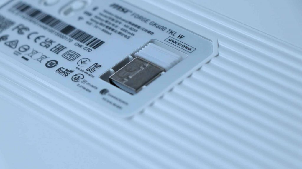 When used in wired mode, the detachable cable can be routed to the left or right, helping maintain a tidy workspace. Connectivity is managed underneath the keyboard, where the USB dongle for 2.4 GHz wireless operation is stored in a magnetic compartment — a practical design, though heavy travelers might want to secure it with a bit of Velcro.