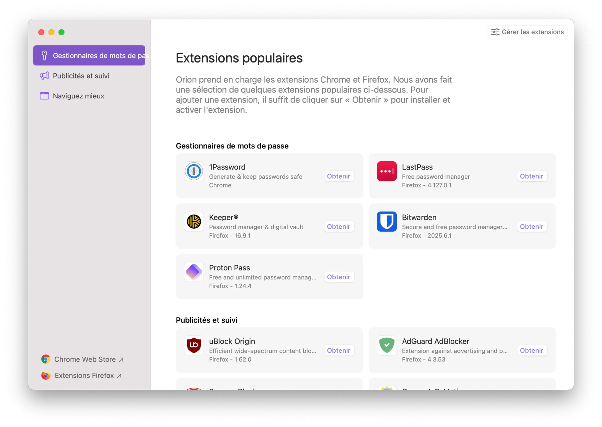 Orion supports browser extensions from Chrome, Firefox, and Safari.