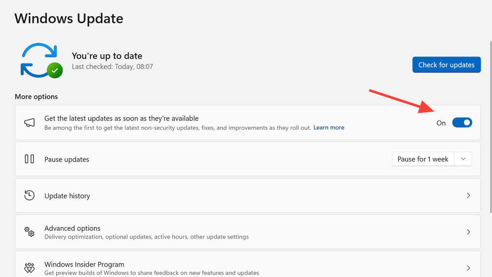 Open Settings → Windows Update, then toggle on “Get the latest updates as soon as they’re available.”