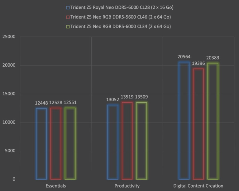 Compared to DDR5-5600, DDR5-6000 delivers about +5% higher scores. Both DDR5-6000 kits perform nearly identically.