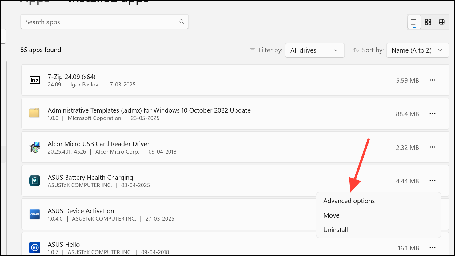 Step 3: Locate the problematic app, click the three-dot menu (or select the app) and choose “Advanced options.”