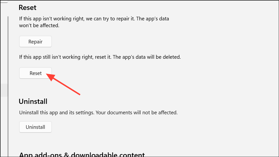 Step 4: In the “Reset” section, first try “Repair.” If the issue persists, use “Reset,” which will restore the app to its default settings.