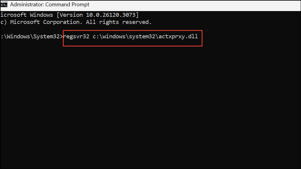 Step 2: To register the main DLL, type regsvr32 c:\windows\system32\actxprxy.dll
