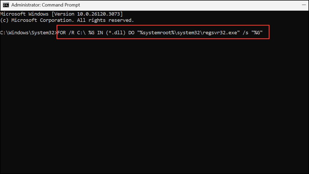 Step 3: If the problem continues, you can re-register all DLL files within the system directory by running: FOR /R C:\ %G IN (*.dll) DO "%systemroot%\system32\regsvr32.exe" /s "%G"