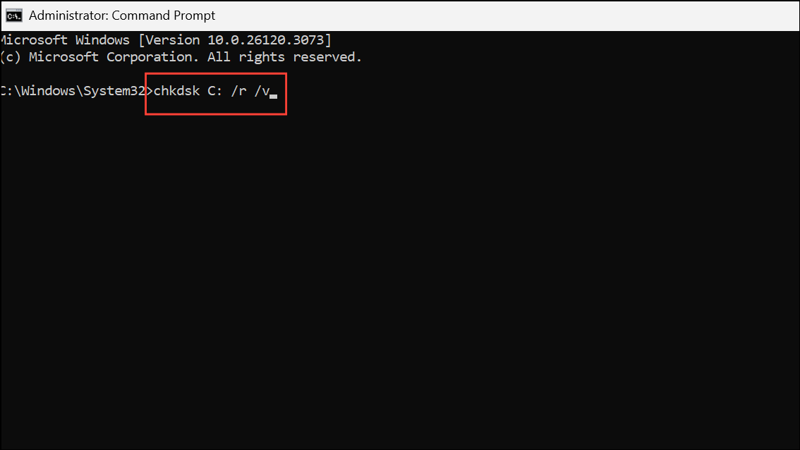 Step 2: Type chkdsk C: /r /v