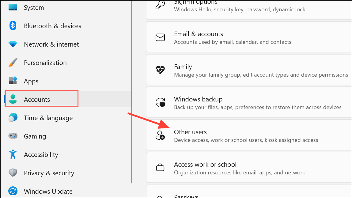 Step 1: Open Settings and go to “Accounts” > “Other users.”