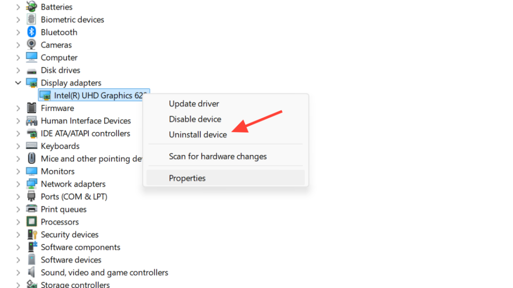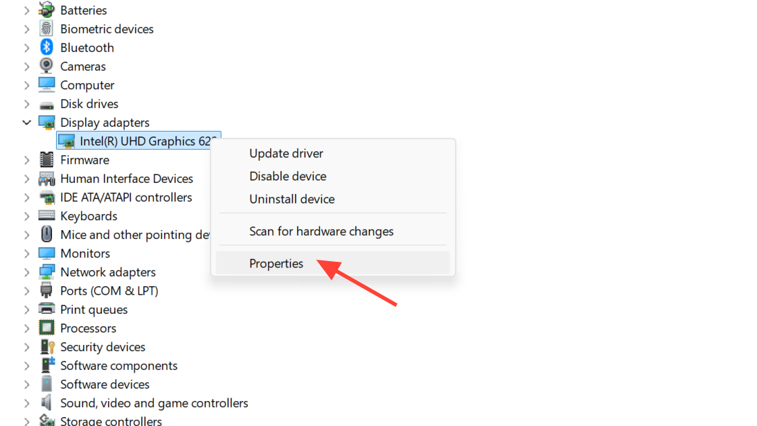 - Right-click your GPU (Intel, AMD, NVIDIA, etc.) → Properties