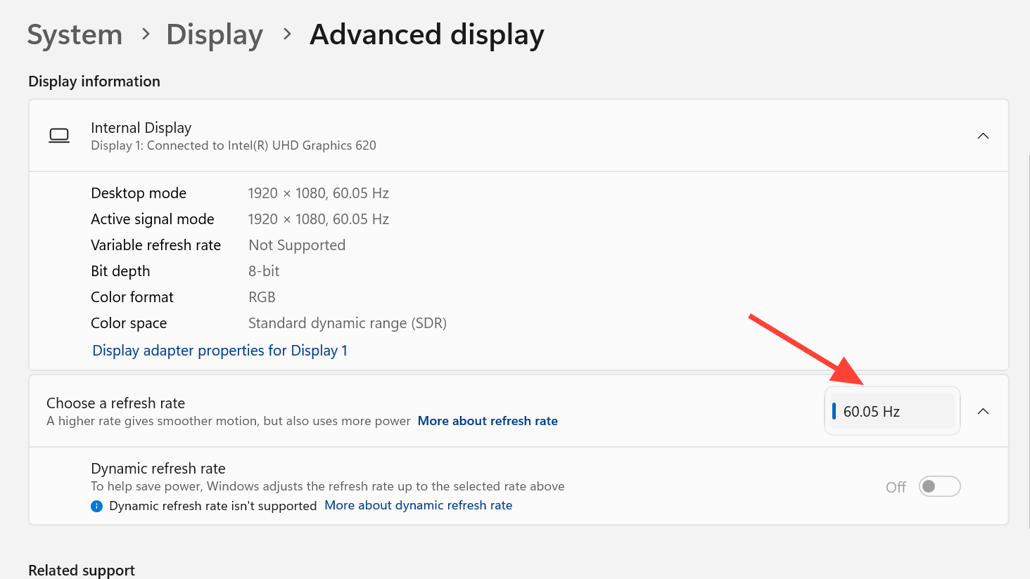 Desktop → Display Settings → Advanced Display → Choose a refresh rate